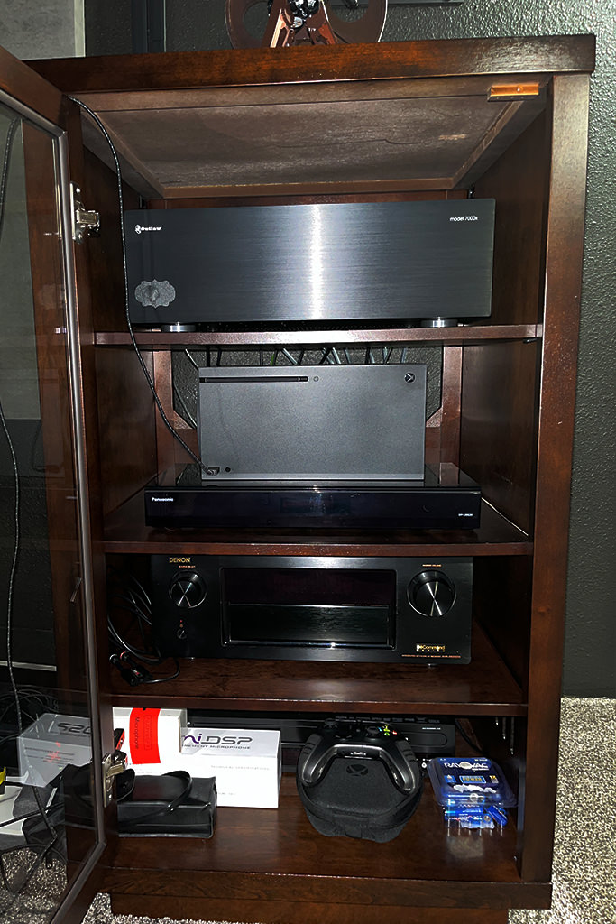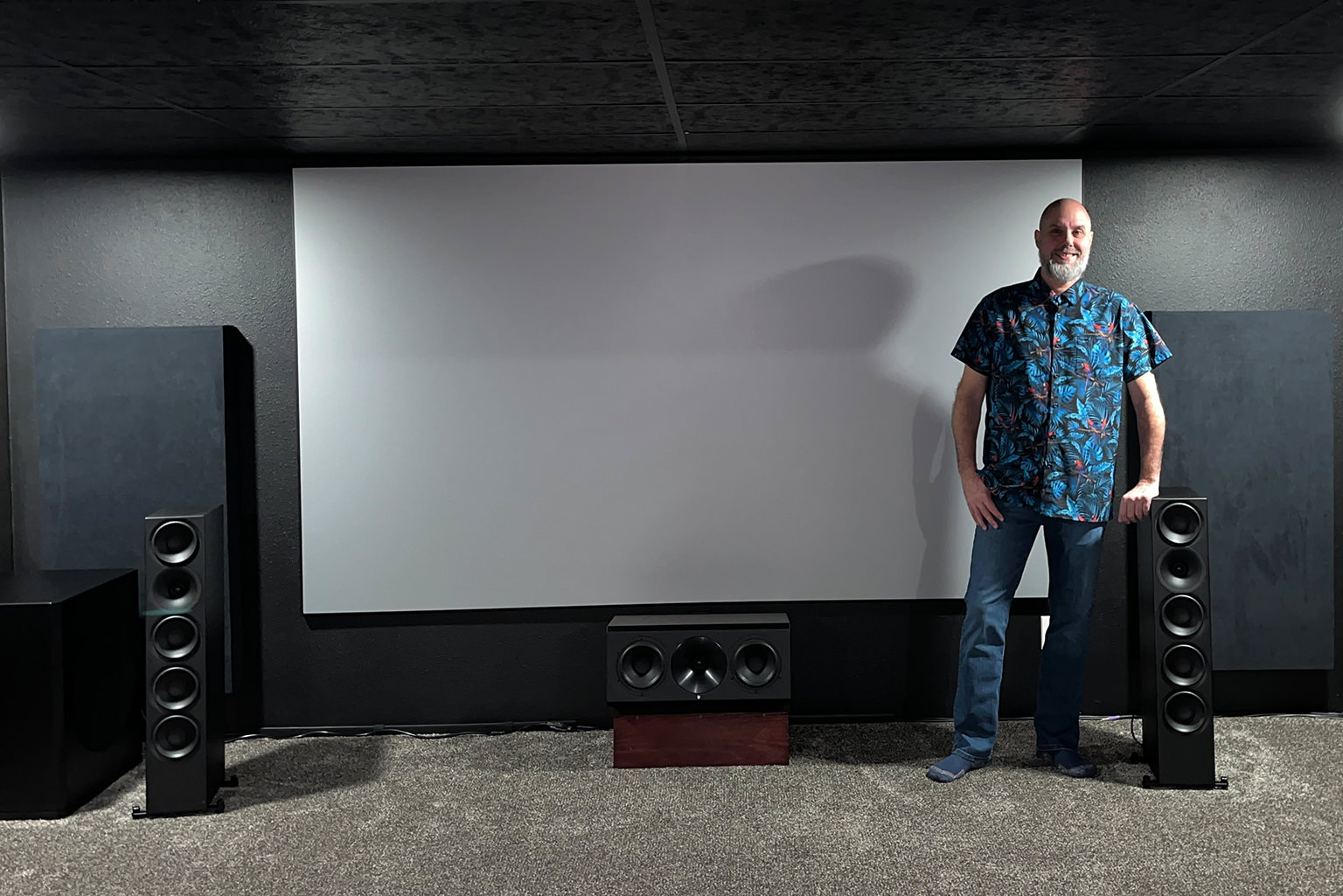 120” alr projector screen. Epson 6050UB projector. Denon 6200W receiver. Outlaw Audio 7000X amp. Panasonic UB820 4k Blu Ray player. Arendal 1723 1V sub. 1723 S center channel, 1961 towers, 1961 monitors for the side and rear surrounds, and 2ea. 1961 Atmos speakers. Still need more subs!!! Lol.